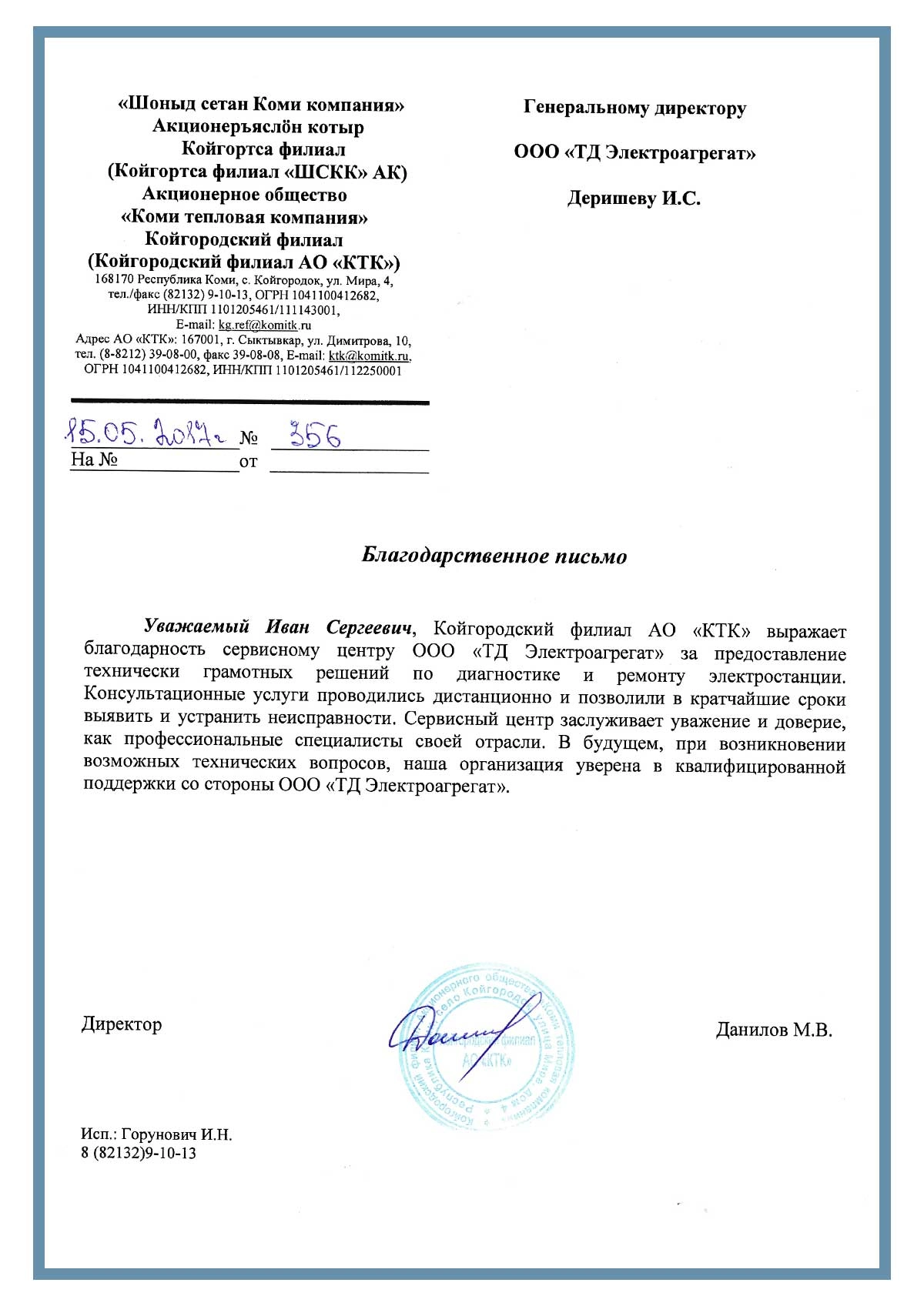 ) ) [reviewBody] => Генеральному директору завода "ТД Электроагрегат" Деришеву И.С. Уважаемый Иван Сергеевич, Койгородский филиал АО "КТК" выражает благодарность сервисному центру ООО «ТД Электроагрегат» за предоставление технически грамотных решений по диагностике и ремонту электростанции. Консультационные услуги проводились дистанционно и позволили в кратчайшие сроки выявить и устранить неисправности. Сервисный центр заслуживает уважение и доверие, как профессиональные специалисты своей отрасти. В будущем, при возникновении возможных технических вопросов, наша организация уверена в квалифицированной поддержке со стороны завода «ТД Электроагрегат» Директор Данилов М.В. ) )