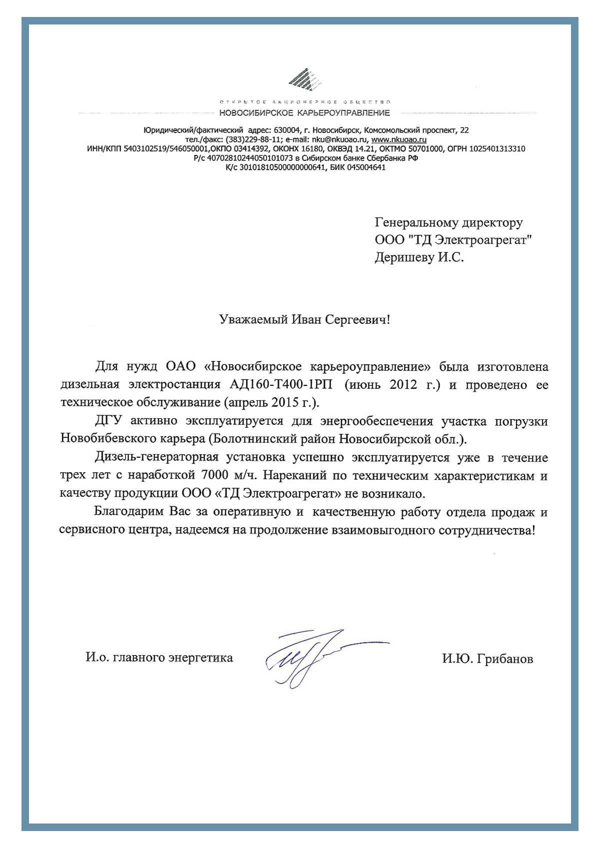 ) ) [reviewBody] => Уважаемый Иван Сергеевич!    Для нужд ОАО "Новосибирское карьероуправление" была изготовлена дизельная электростанция АД160-Т400-1РП (июнь 2012 г) и проведено ее техническое обслуживание (апрель 2015 г.)    ДГУ активно эксплуатируется для энергообеспечения участка погрузки Новобибевского карьера (Болотнинский район Новосибирской обл.).     Дизель-генераторная установка успешно эксплуатируется уже в течение трех лет с наработкой 7000 м/ч. Нареканий по техническим характеристикам и качеству продукции завода "ТД Электроагрегат" не возникало. Благодарим Вас за оперативную и качественную работу отдела продаж и сервисного центра, надеемся на продолжение взаимовыгодного сотрудничества. И.о. главного энергетика  И.Ю. Грибанов ) )