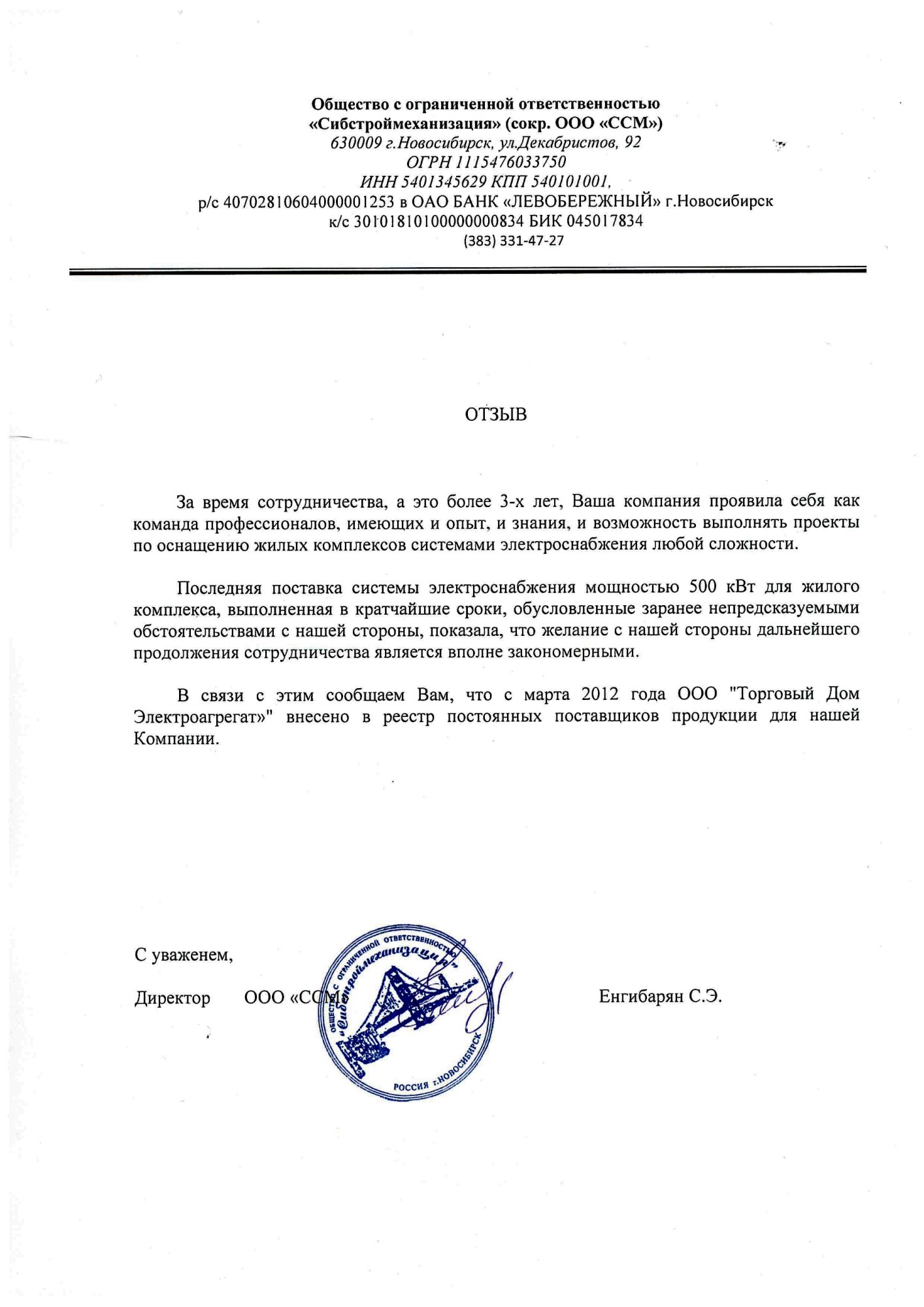 Отзыв контрагента о компании ООО «ТД Электроагрегат» и исполненном проекте для ООО "Сибстроймеханизация", г. Новосибирск