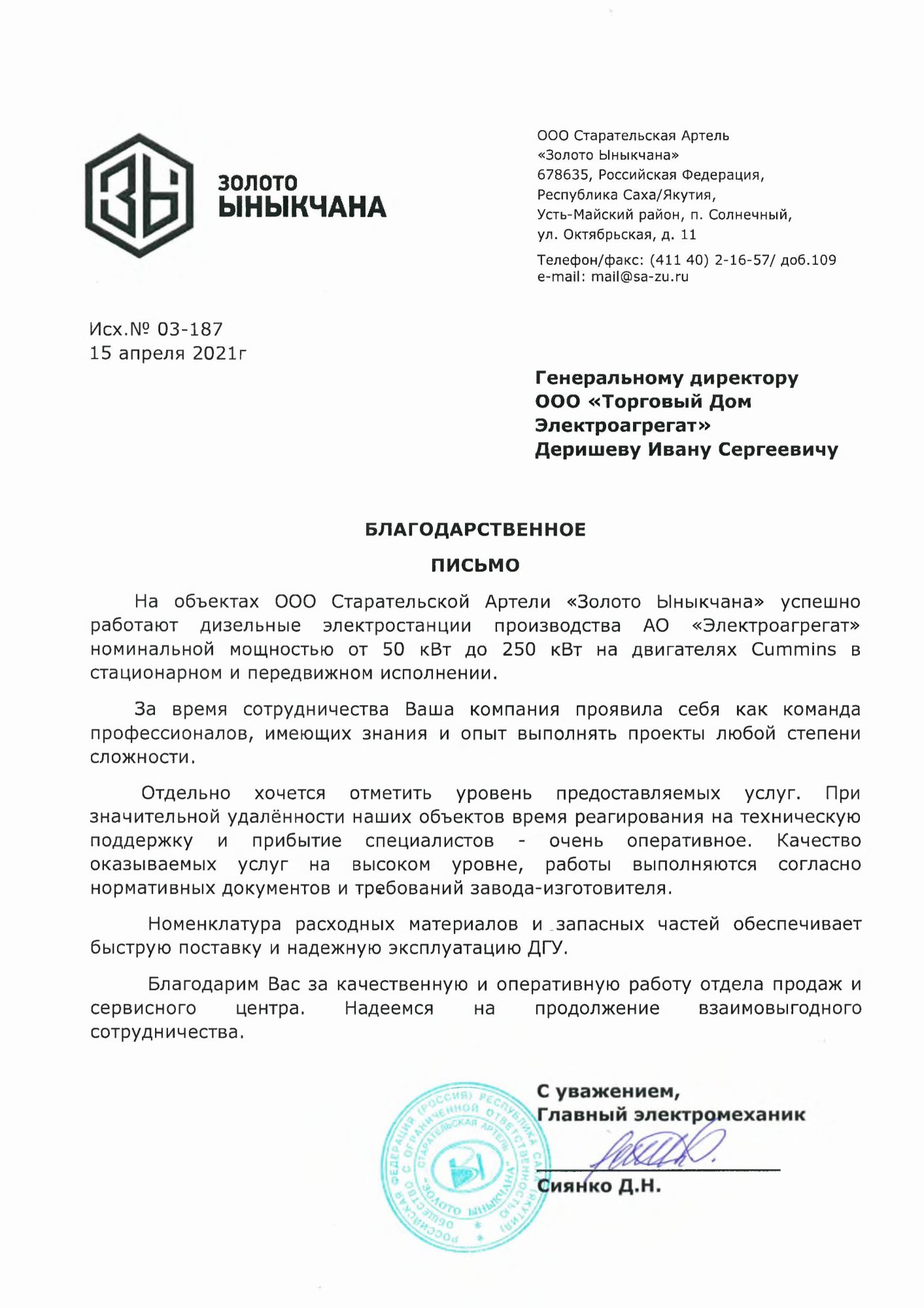 Отзыв контрагентов о компании ООО «ТД Электроагрегат» и  исполненном проекте для ООО Старательская Артель "Золото Ыныкчана"